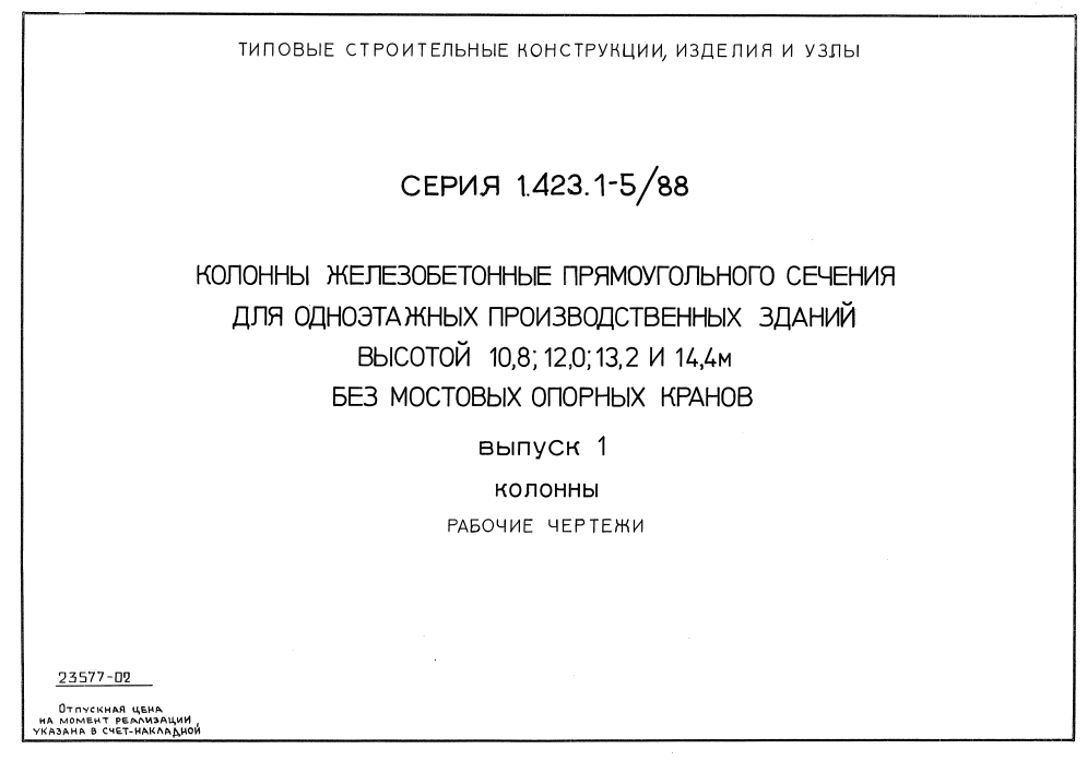 Серия 1.423.1-5/88. Колонны железобетонные прямоугольного сечения для одноэтажных производственных зданий высотой 1.0. 8.0. 12.0.13.2. и 14.4 м без мостовых опорных кранов